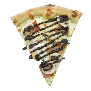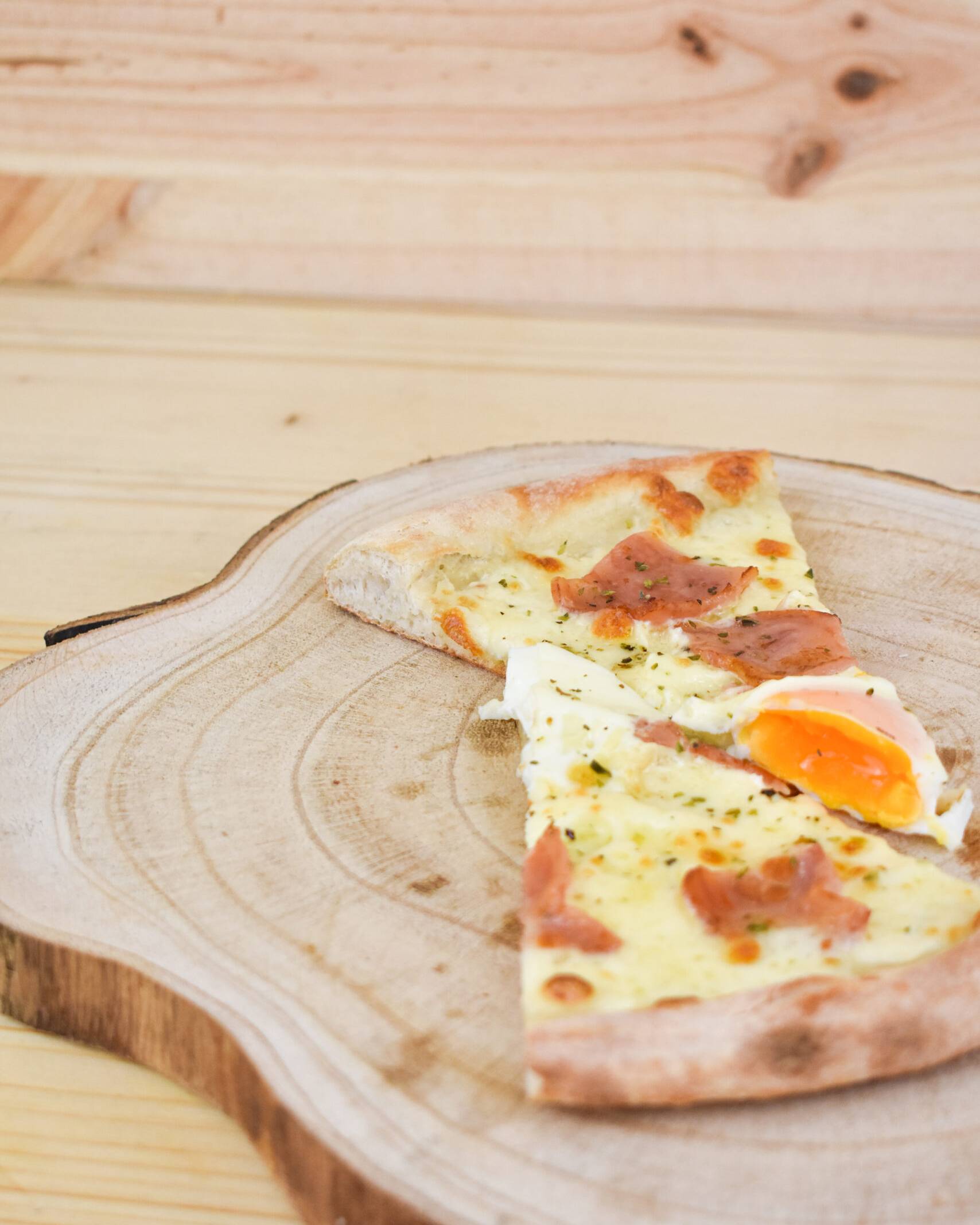 Nata, mozzarella, bacon, champiñones, salsa de trufa y huevo.