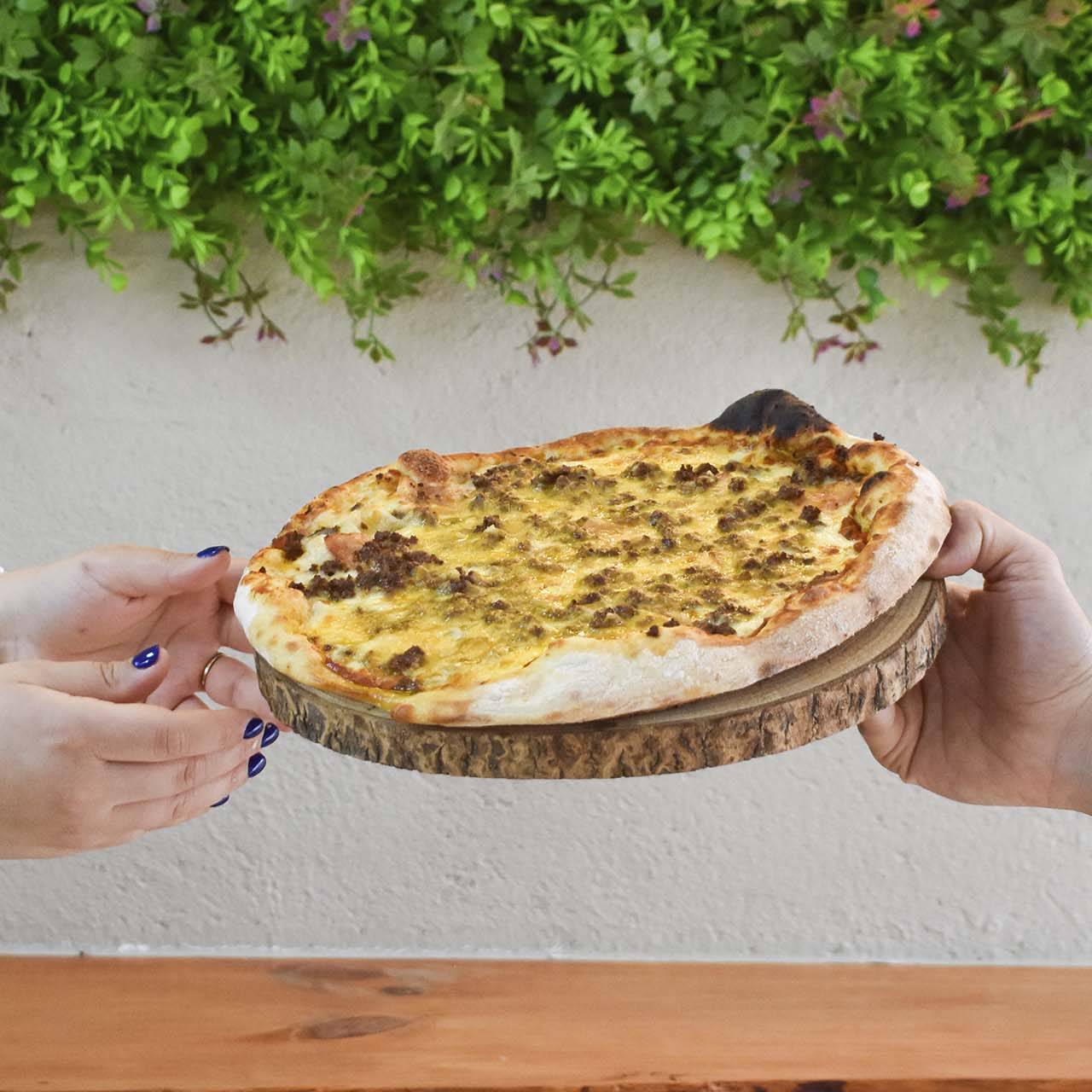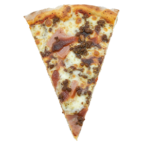 Salsa de tomate, mozzarella, carne, bacon y extra de queso cheddar.