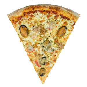Salsa de tomate, mozzarella, atún, gambas, palitos de cangrejo y mejillones.